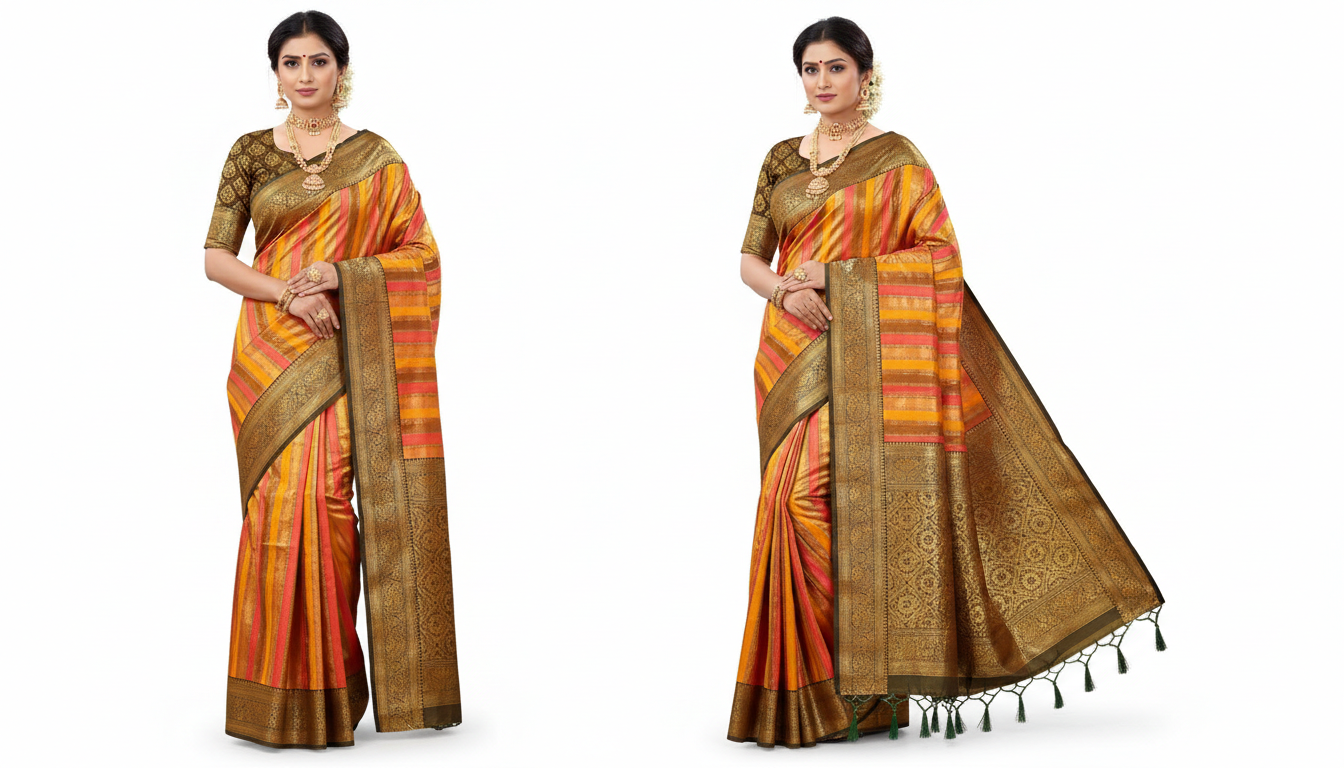 The body of the saree is characterized by its sophisticated multi-color vertical stripes. By blending warm tones of orange, yellow, and red, the design mimics the radiant colors of a sun-drenched horizon. Vertical stripes are particularly favored for their ability to create an elongated, slimming silhouette, providing a flattering fit for all body types. The high-quality silk blend fabric offers a soft, luxurious feel against the skin while providing the necessary “stiffness” to hold crisp, clean pleats.