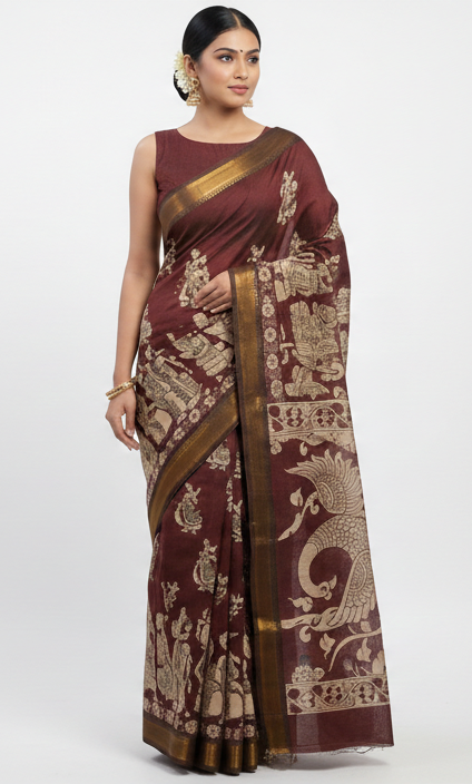 Embrace the timeless allure of Indian heritage with our Hand-Painted Maroon Pen Kalamkari Tussar Silk Saree. This exquisite piece is a celebration of the legendary Kalamkari art form, originating from the temple towns of Andhra Pradesh. Each inch of this saree tells a story, meticulously hand-drawn by skilled artisans using a bamboo pen (kalam) and organic, earth-toned dyes.