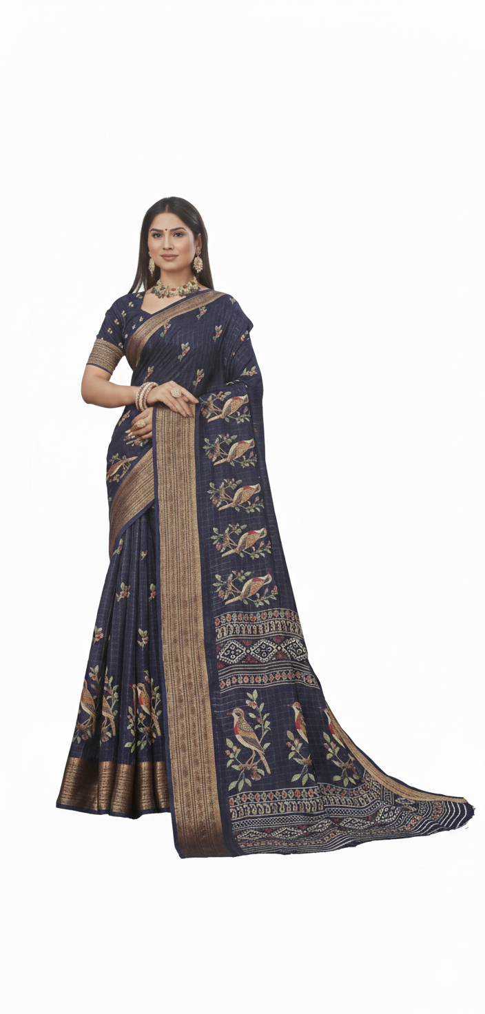Embrace the deep allure of the night with our Midnight Navy Blue Nature Motif Saree, a masterpiece of textile design that brings traditional storytelling to life through fabric. This 2026 collection piece focuses on the “Naturalist” trend, merging deep jewel tones with detailed biological illustrations.