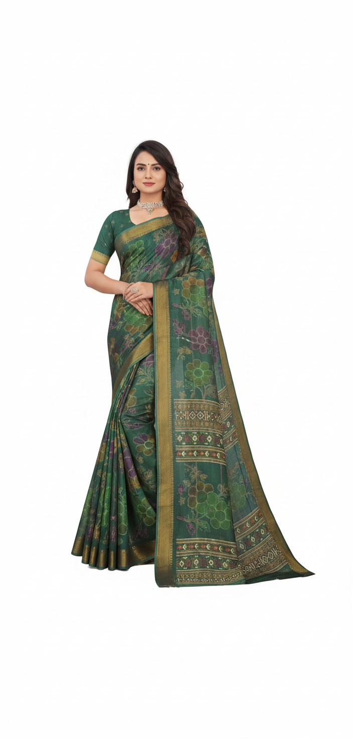 Whether it is a grand Diwali gala, a family wedding, or a formal dinner, this Teal Green saree ensures a presence of quiet authority and grace. To maintain the vibrancy of the digital print and the integrity of the silk fibers, we recommend professional dry cleaning only. Store it in a cool, dry place wrapped in soft paper or a muslin bag to keep the Zari border shining for years to come.