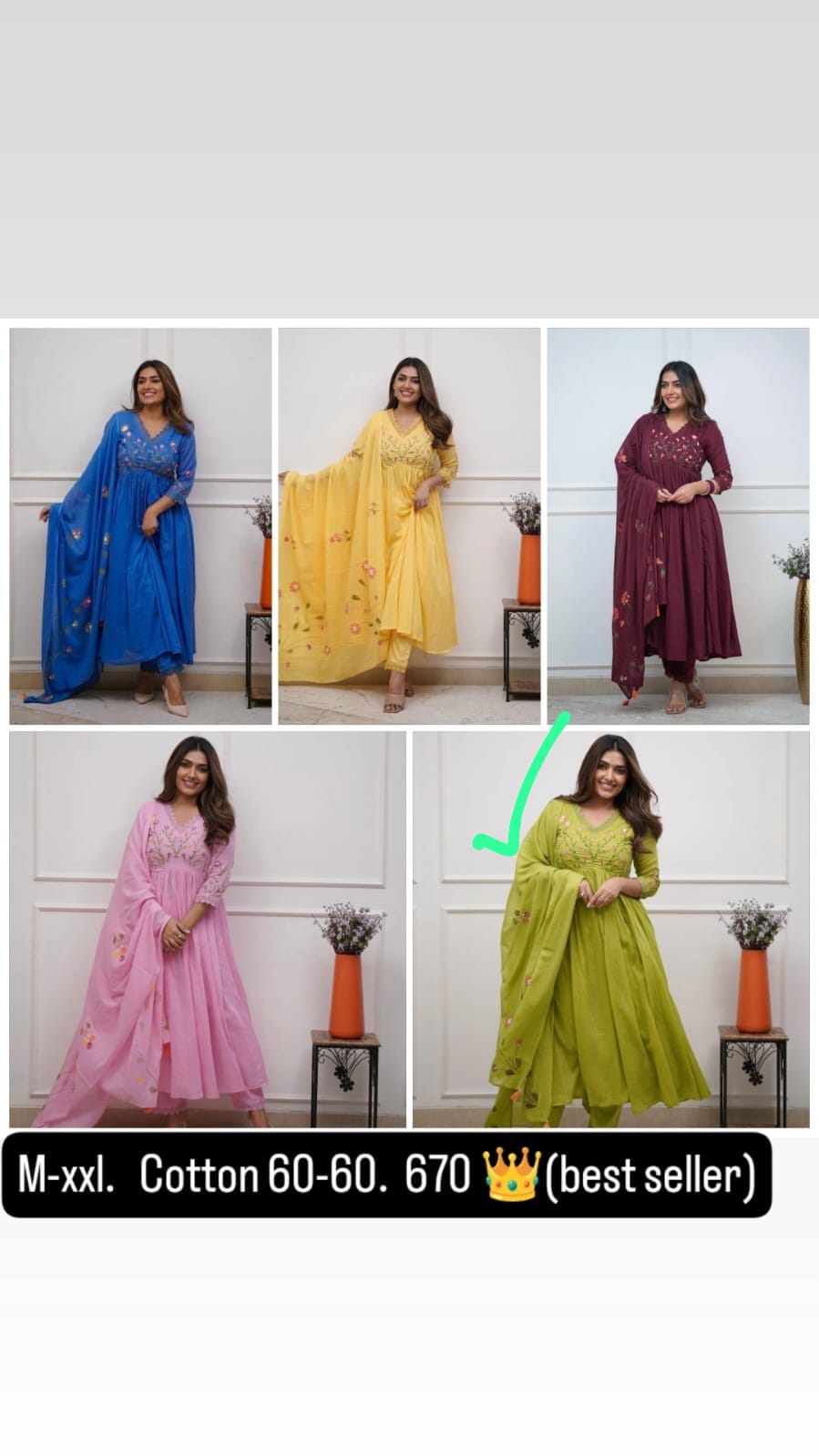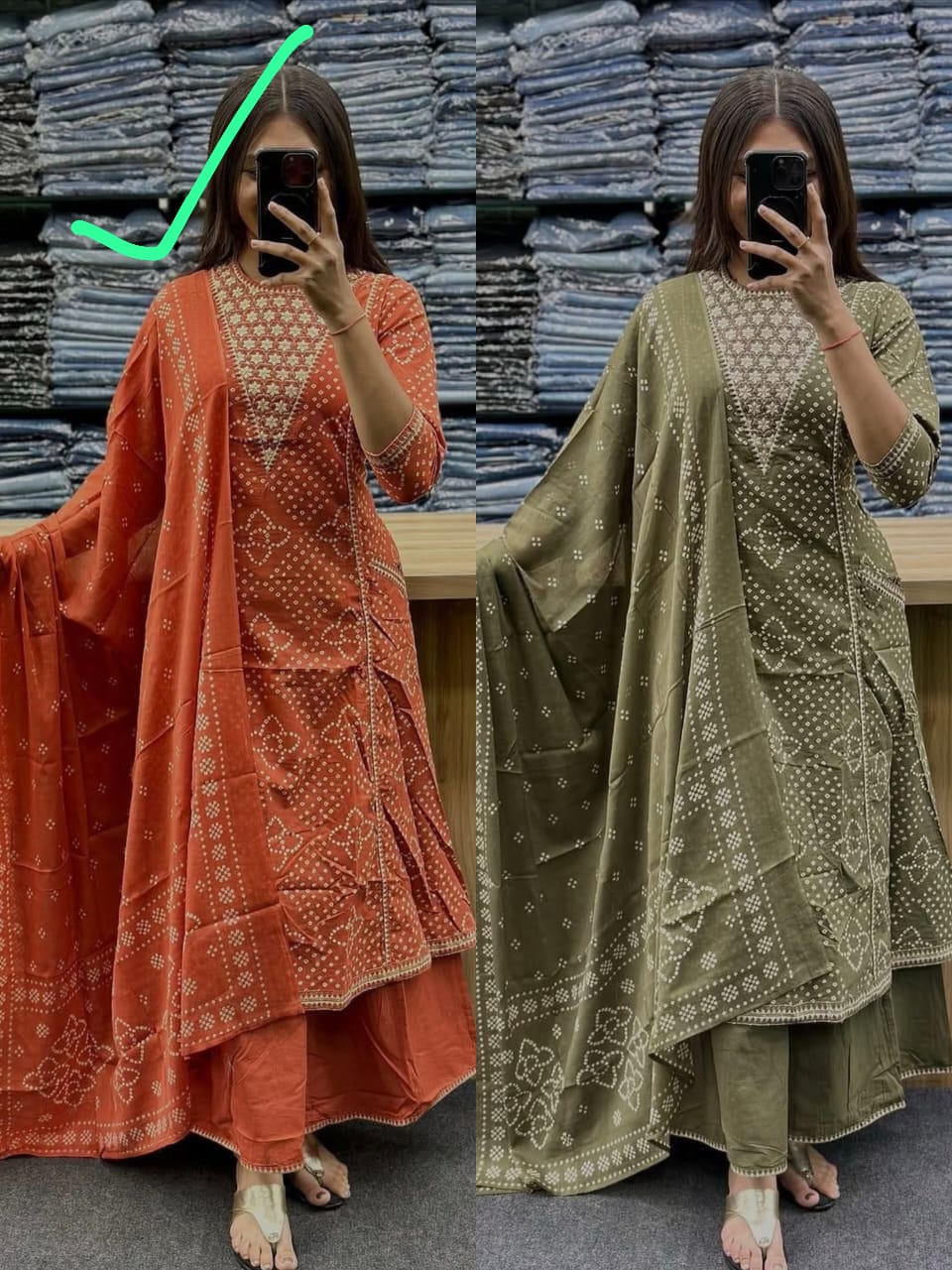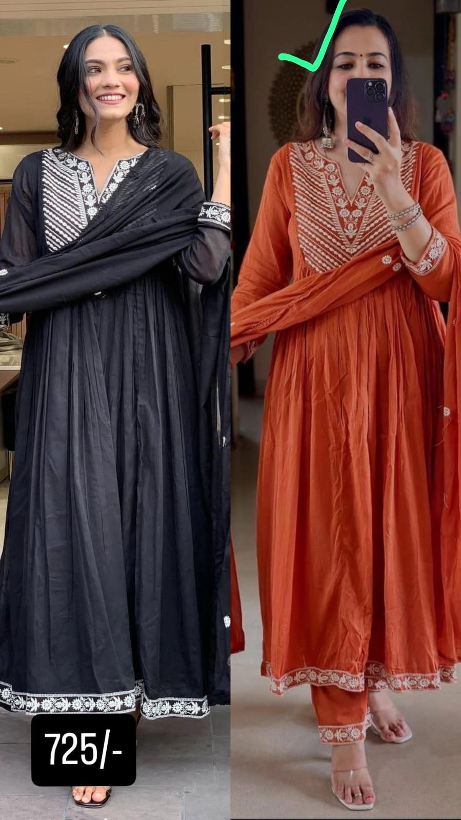 Available in two sophisticated earthy tones—Rust Orange and Olive Green—this set is a versatile addition to your festive collection. Pair it with oxidized silver jewelry and block heels to complete the regal look.